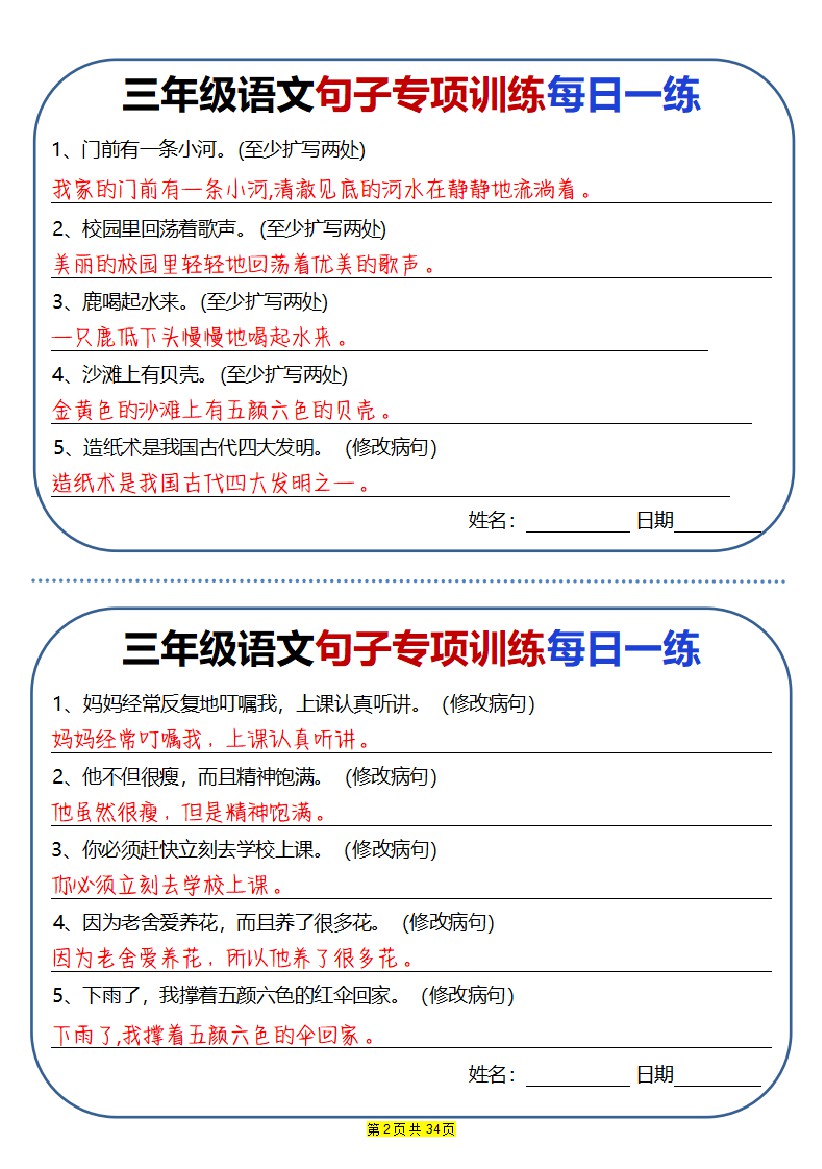 三年级(上)语文 句子专项训练每日一练