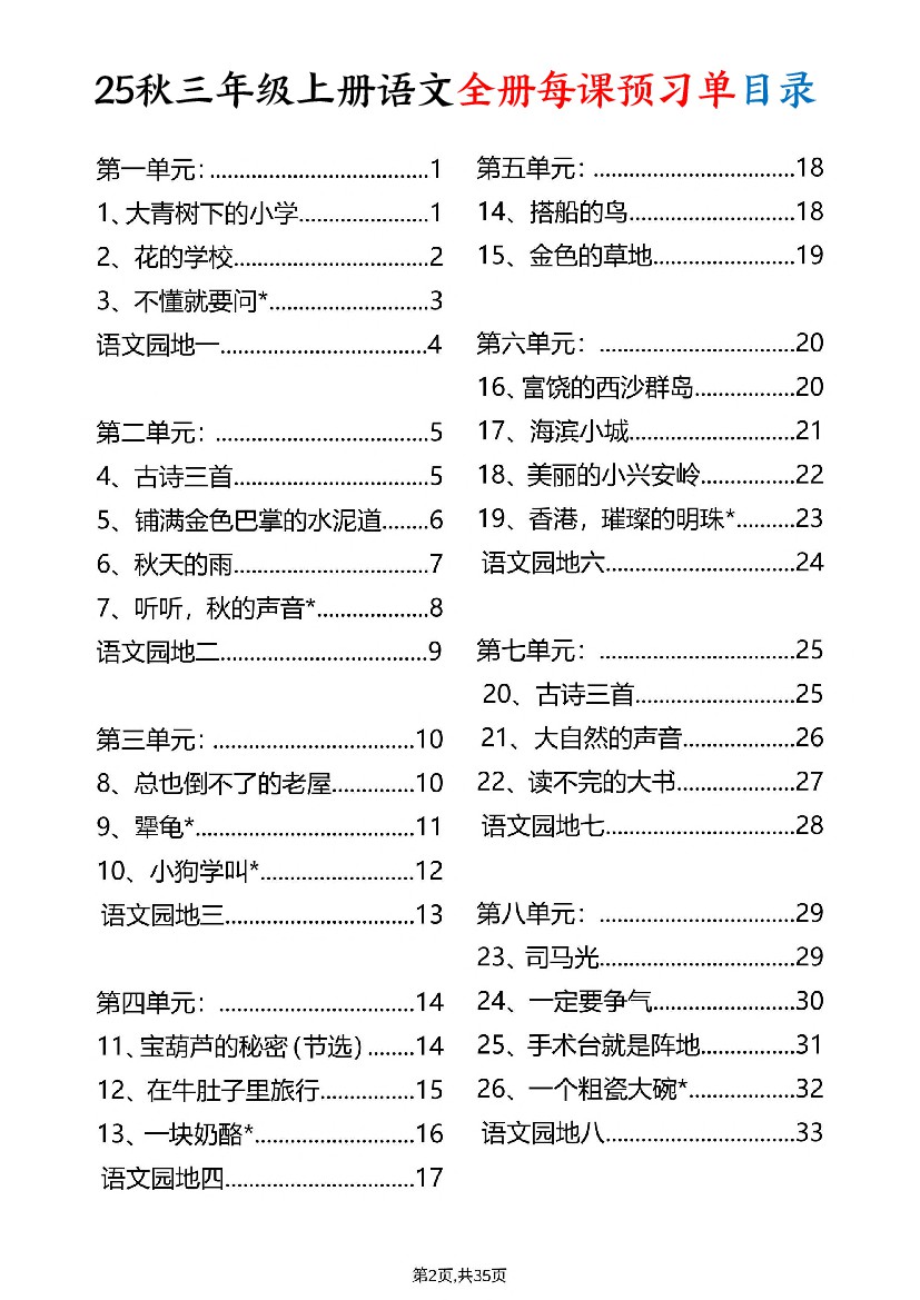 小学 【25秋新版】三上语文全册每课预习单(35页)