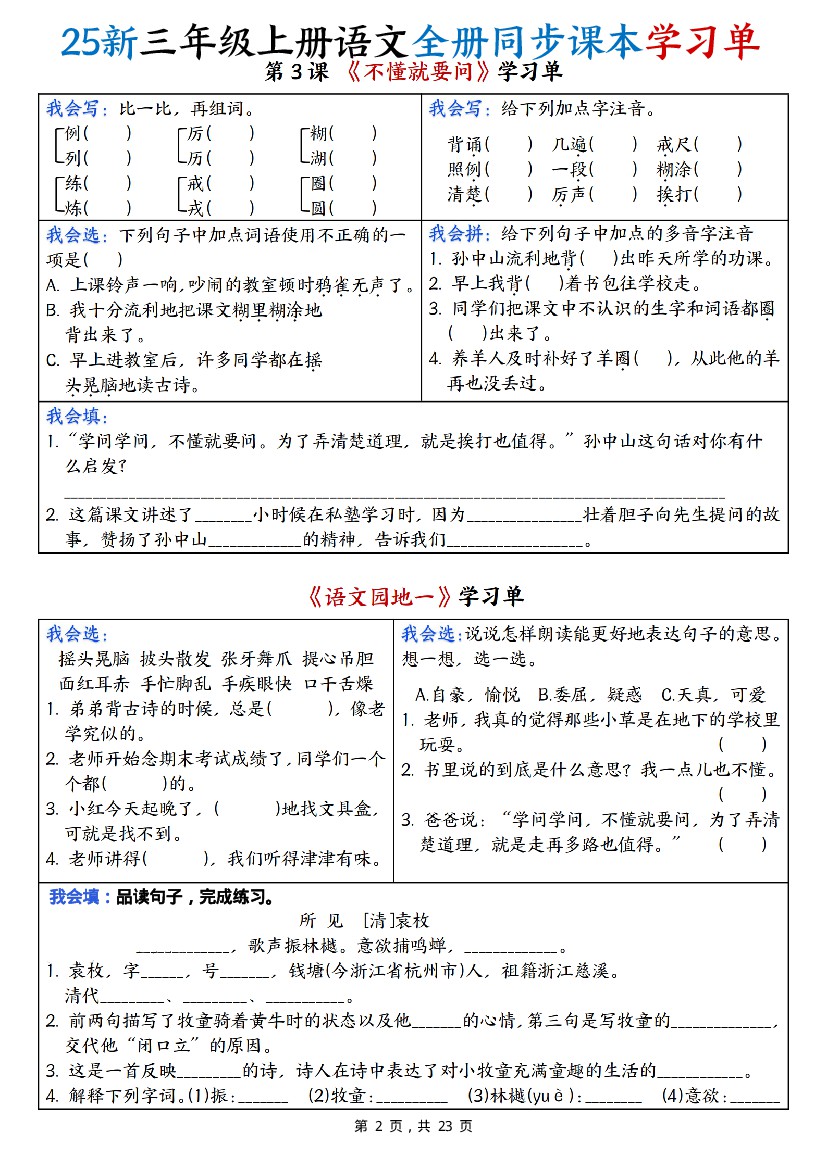 首页 > 全部 > 预习清单 > 25新三上语文全册同步课本学习单(含答案23页)