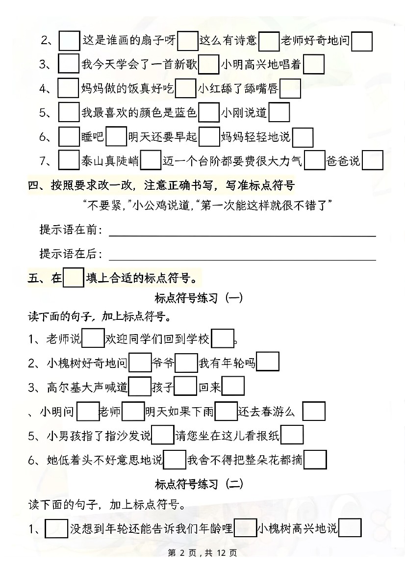 三上语文《提示语标点符号》三大专项练习(含答案12页)