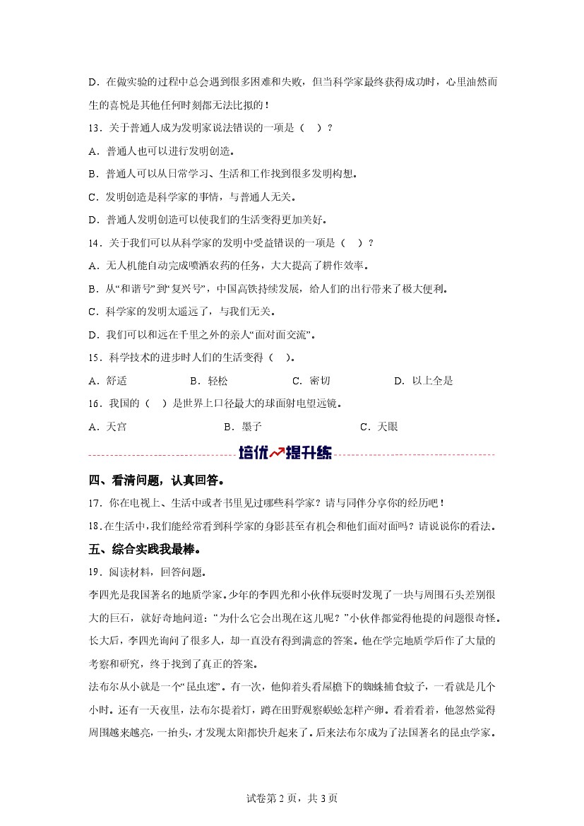 统编版道德与法治三年级上册5 走近科学家分层作业卷