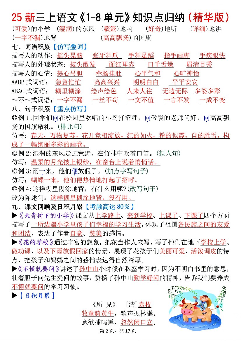 25新三上语文1-8单元知识点归纳(精华版)九大考点17页