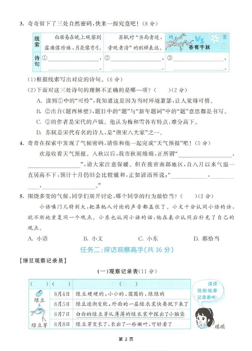 小学 【25学年四上语文第三单元情景测试卷(含答案7页)