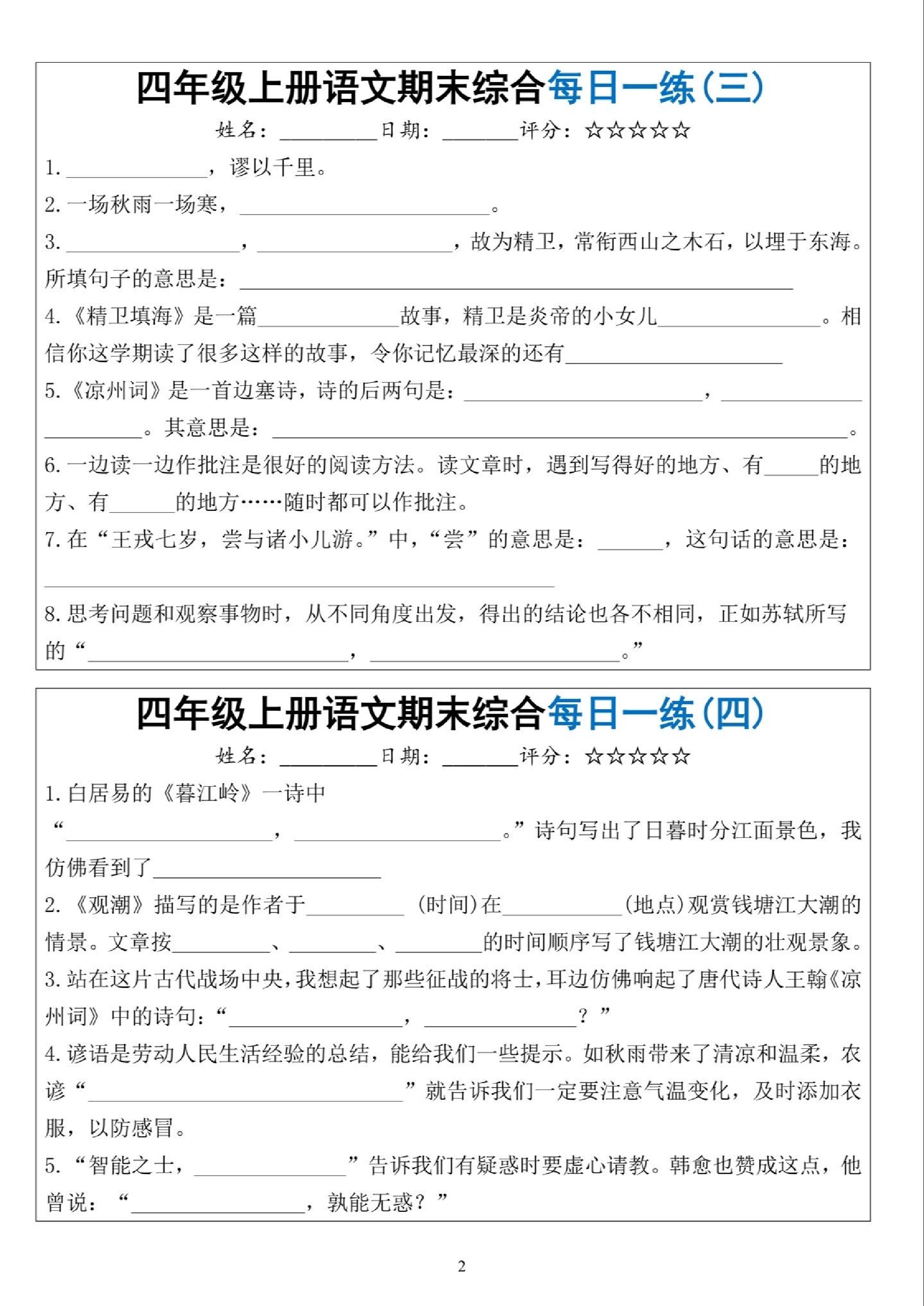小学 四上语文期末综合每天一练(十天))