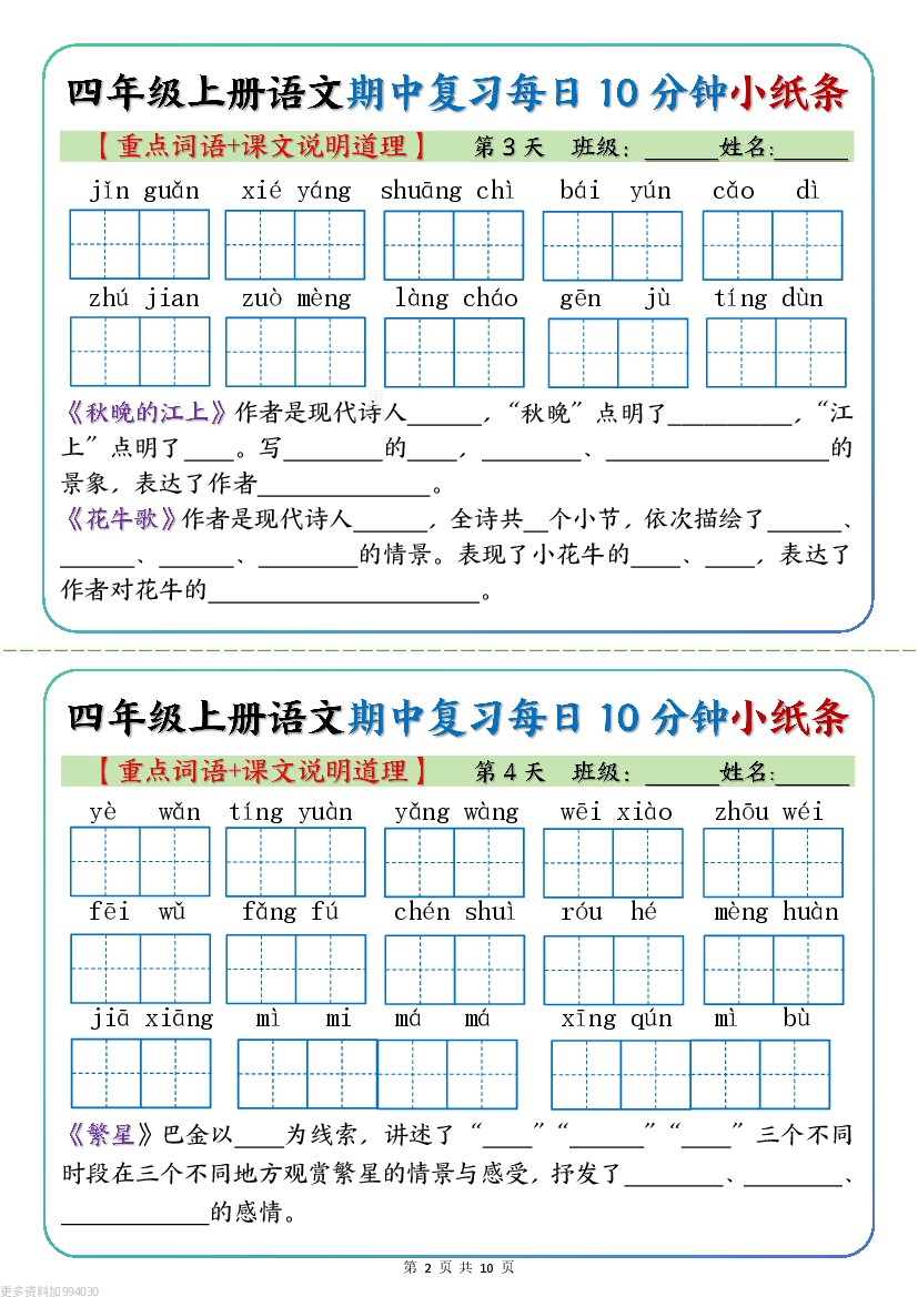 首页 > 全部 > 期中专项 > 四上语文期中复习每日10分钟小纸条15天(重点词语+课文说明道理)10页
