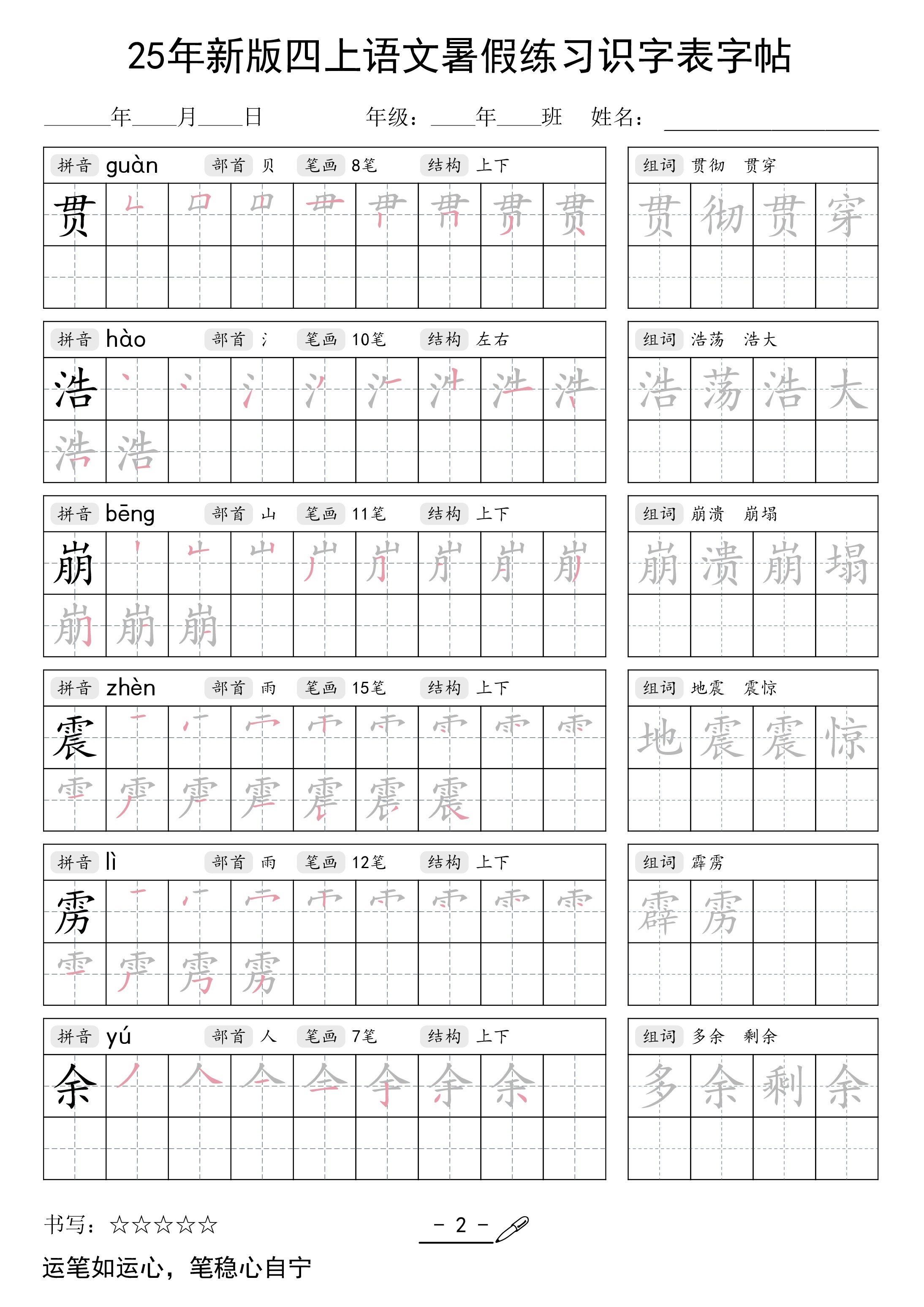 小学 25年新版四上语文暑假练习识字表字帖46页