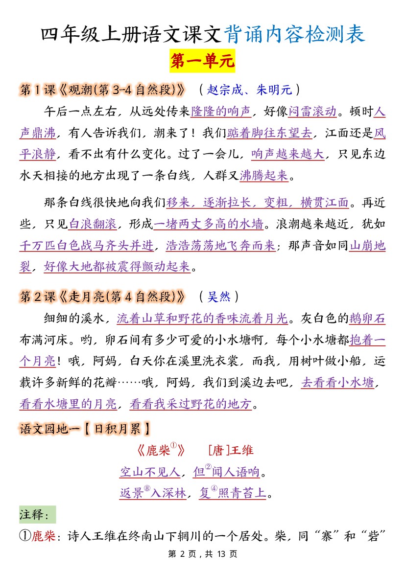 三升四暑假预习四上语文课文背诵内容检测表(13页)