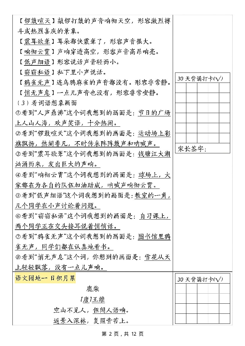 小学 三升四年级上册语文暑假预习30天背诵表(12页)