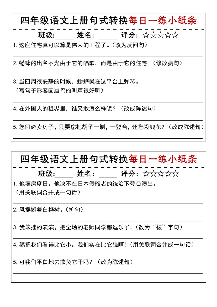 首页 > 全部 > 语句专项 > 四年级上册语文句式转换每日一练小纸条