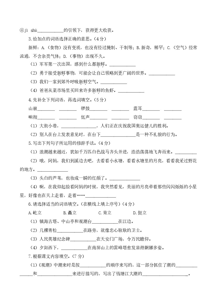 小学 四年级第一次月考(第一二单元)(考试版A4)