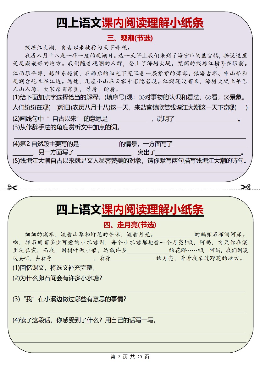 小学 四上丨语文 课内阅读理解小纸条34篇(部编版)-有答案