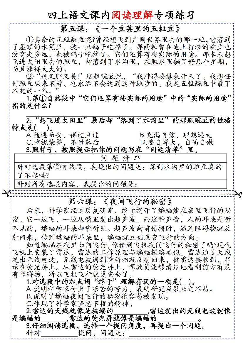 【四上语文】阅读-【课内阅读理解专项(15页)】