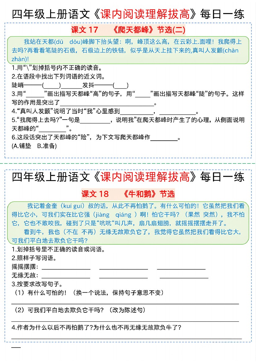 小学 四上语文《课内阅读理解拔高》每日一练