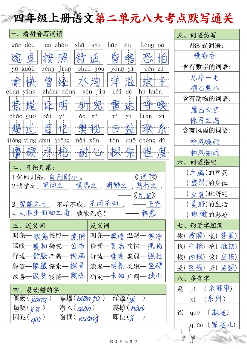 小学 四年级(上)语文 1-8单元八大考点默写通关