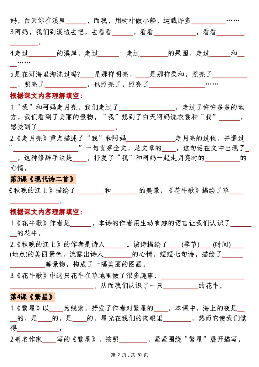 小学 四上语文1-8单元课文重点内容梳理归纳(空白+答案30页)