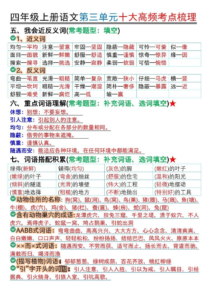 小学 四年级上册语文第三四单元十大高频考点梳理_