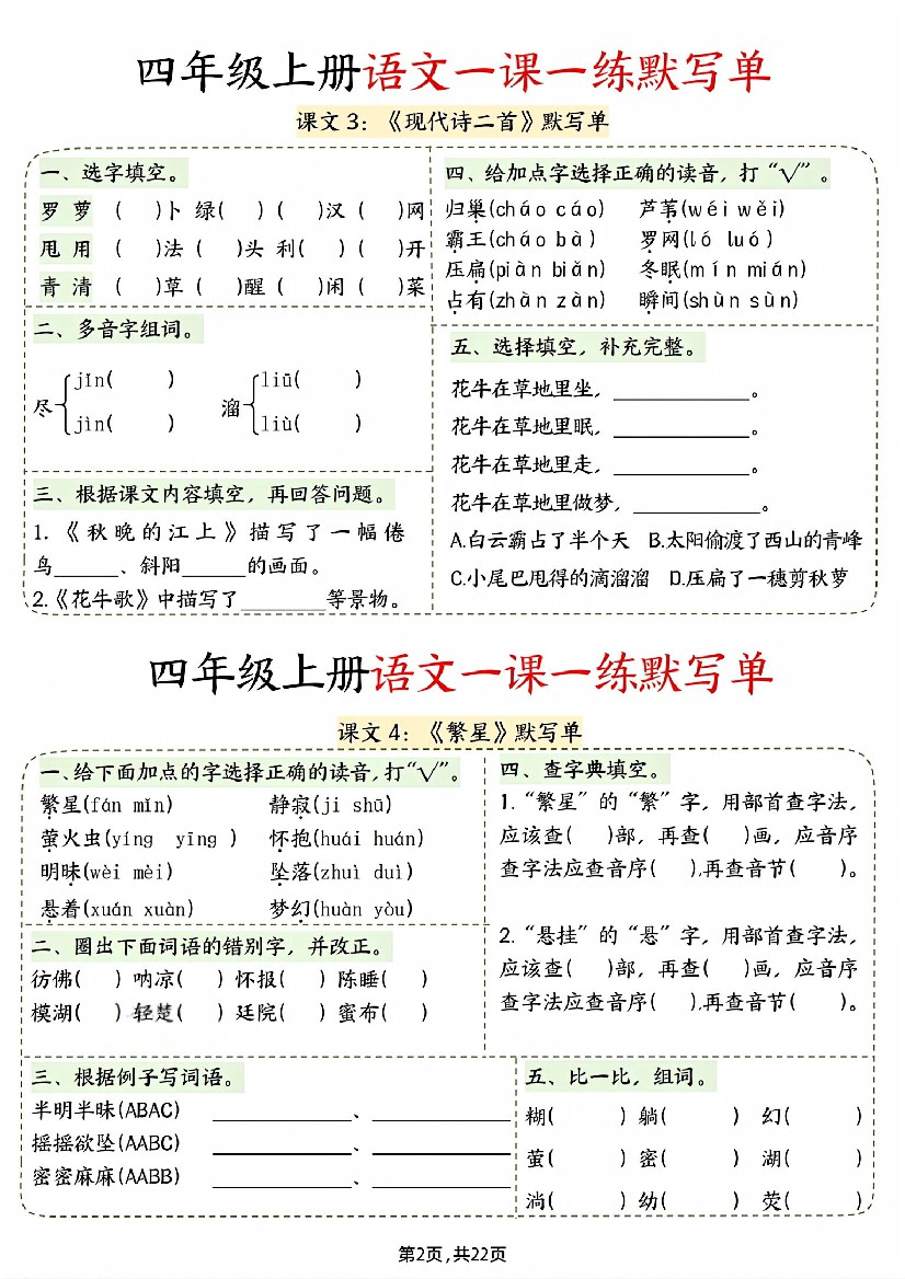 首页 > 全部 > 专项练习 > 四上语文一课一练默写单(含答案22页)