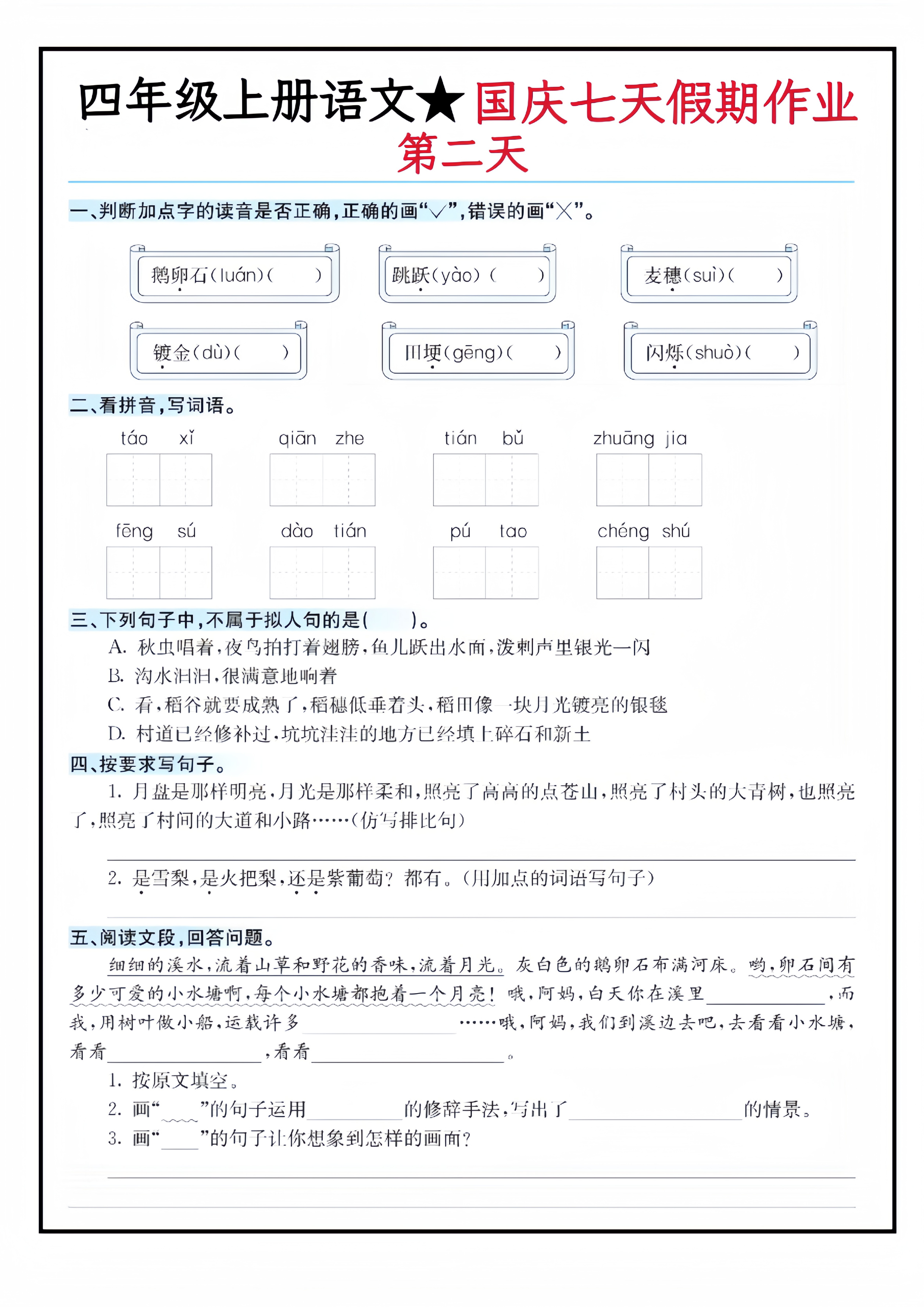 首页 > 全部 > 专项练习 > 四年级上册语文国庆假期作业