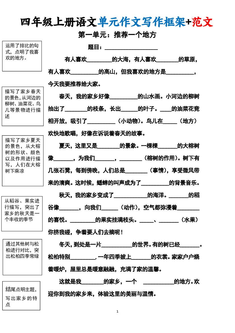 四年级(上)语文1-8单元作文写作框架+范文