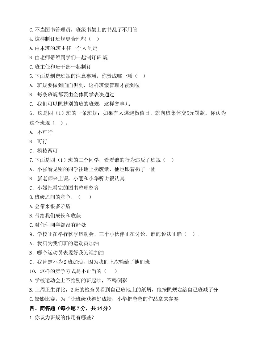 小学 四上道法试题-第一单元 与班级共成长 部编版(含答案)