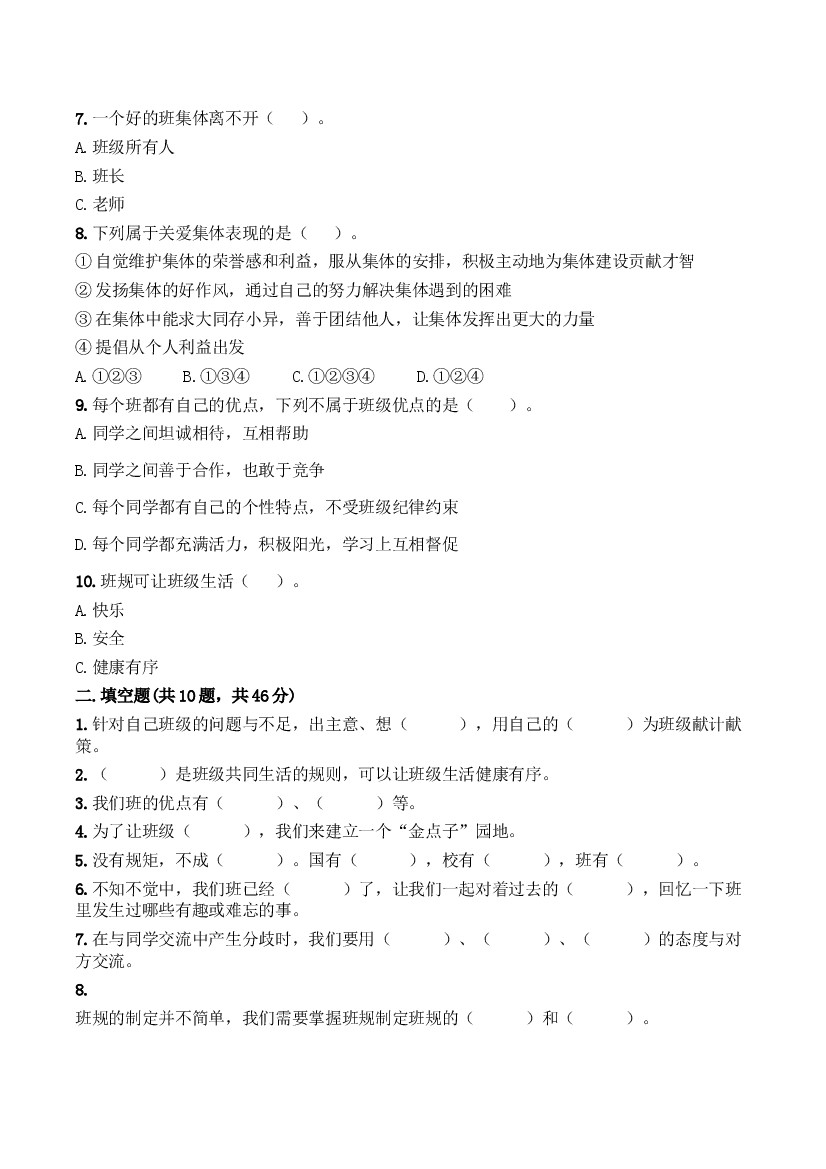 小学 四上道法试题-第一单元 与班级共成长 百分卷 部编版(含答案)