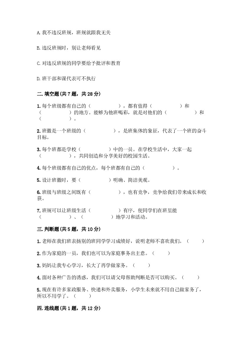 小学 四年级道德与法治上册期末测试卷(含答案)