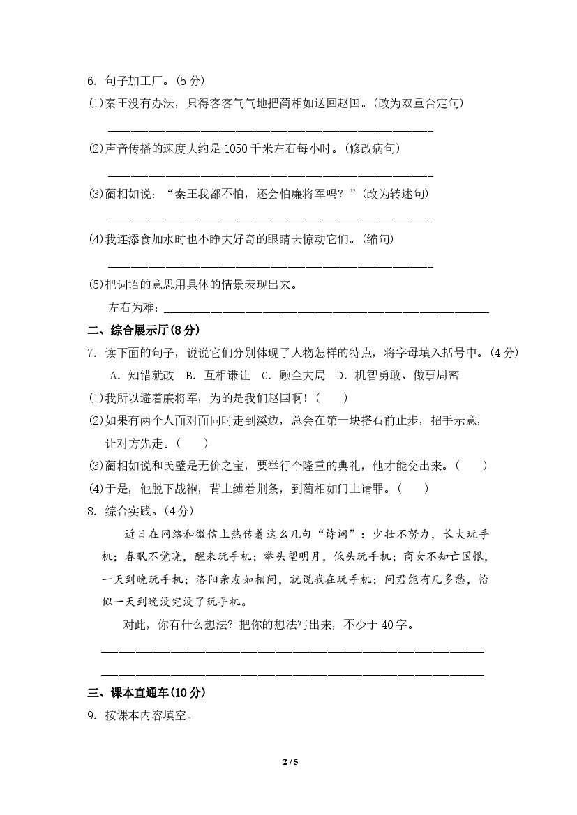 小学 部编版五年级上册语文第二单元测试卷(含答案)