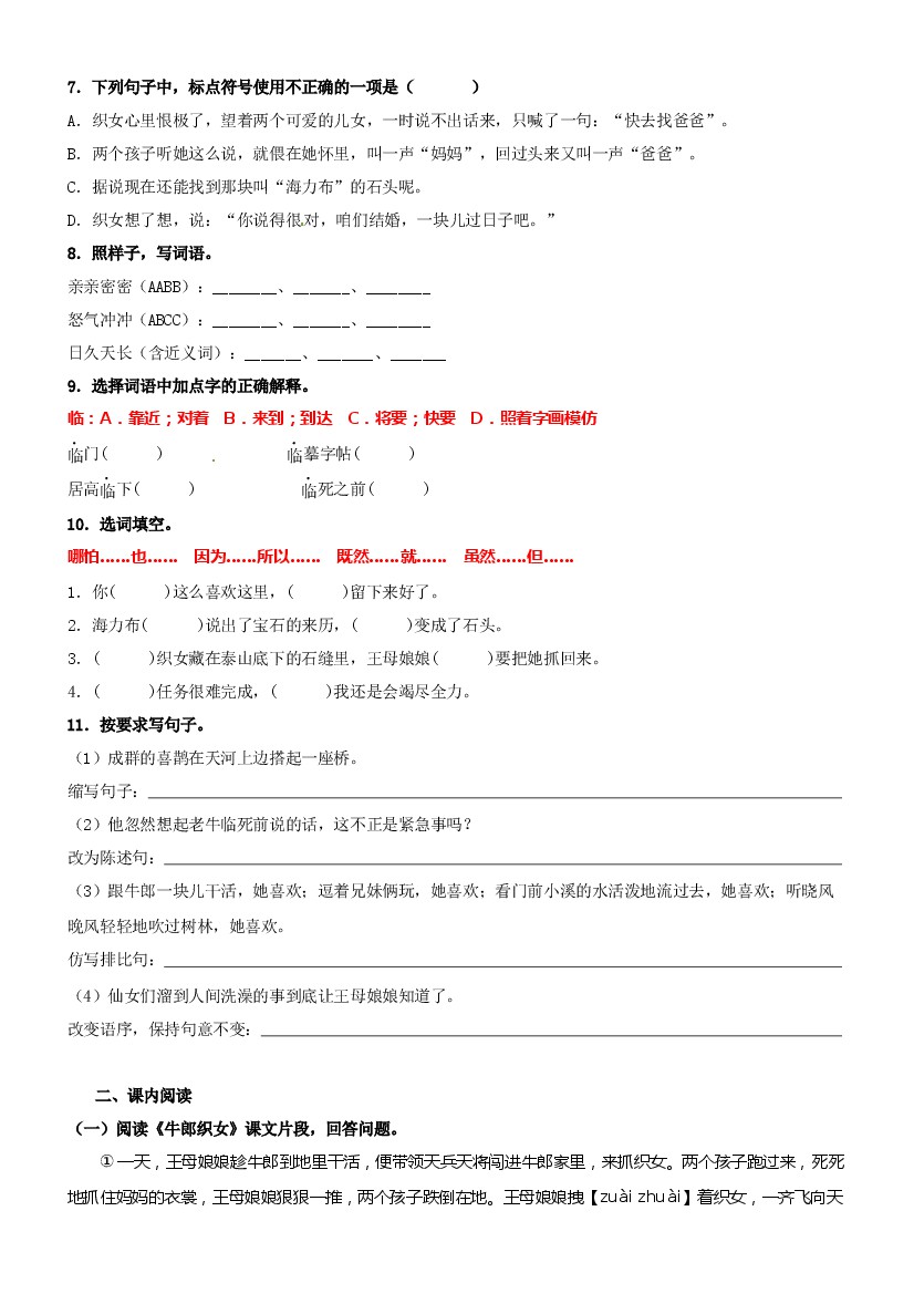 首页 > 全部 > 课时练习 > 第11课《牛郎织女(二)》精品配套练习(基础+阅读)-部编版五年级上册