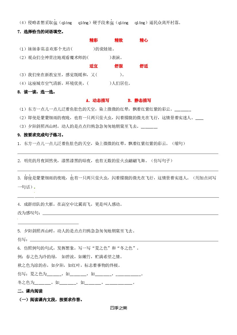 首页 > 全部 > 课时练习 > 第22课《四季之美》精品配套练习(基础+阅读)-部编版五年级上册