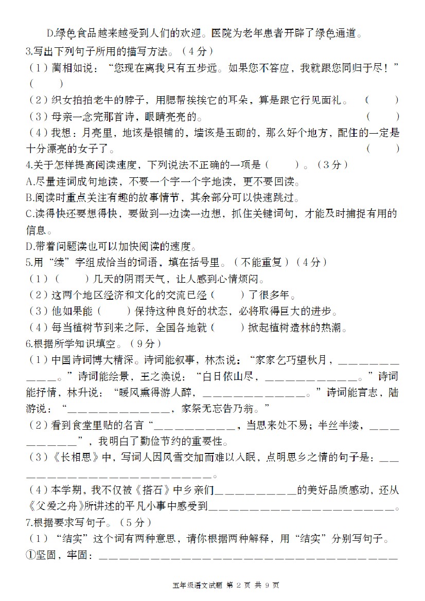 小学 五上语文期末考试名校真题卷