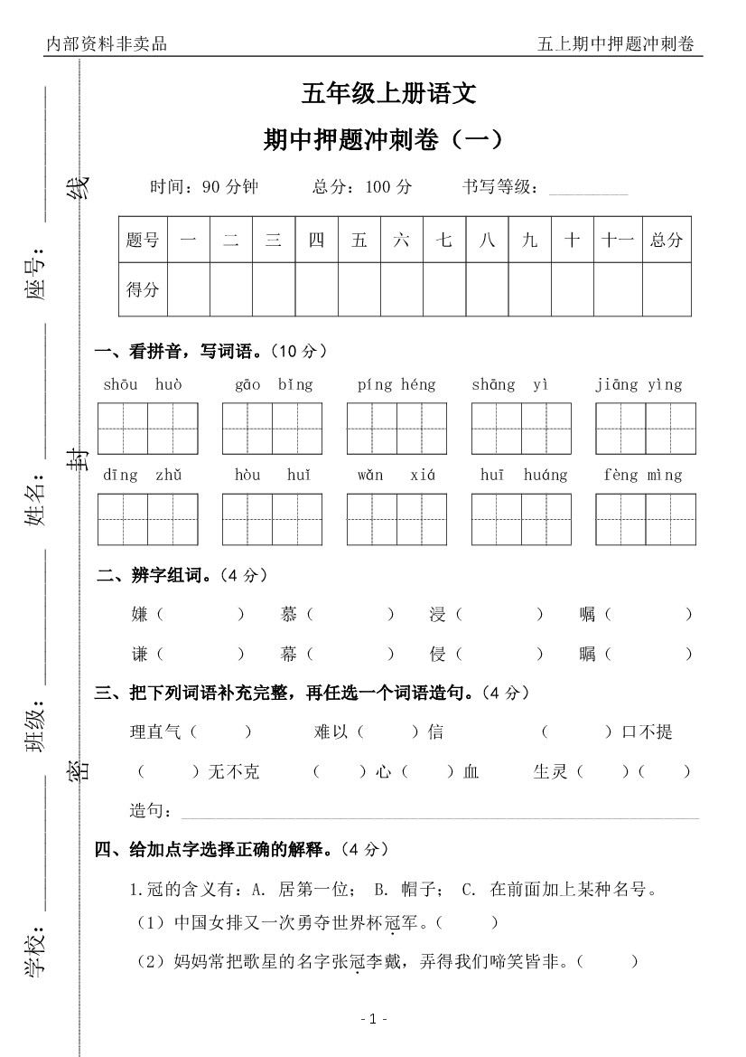 小学 五年语文上册期中押题冲刺卷5套含答案