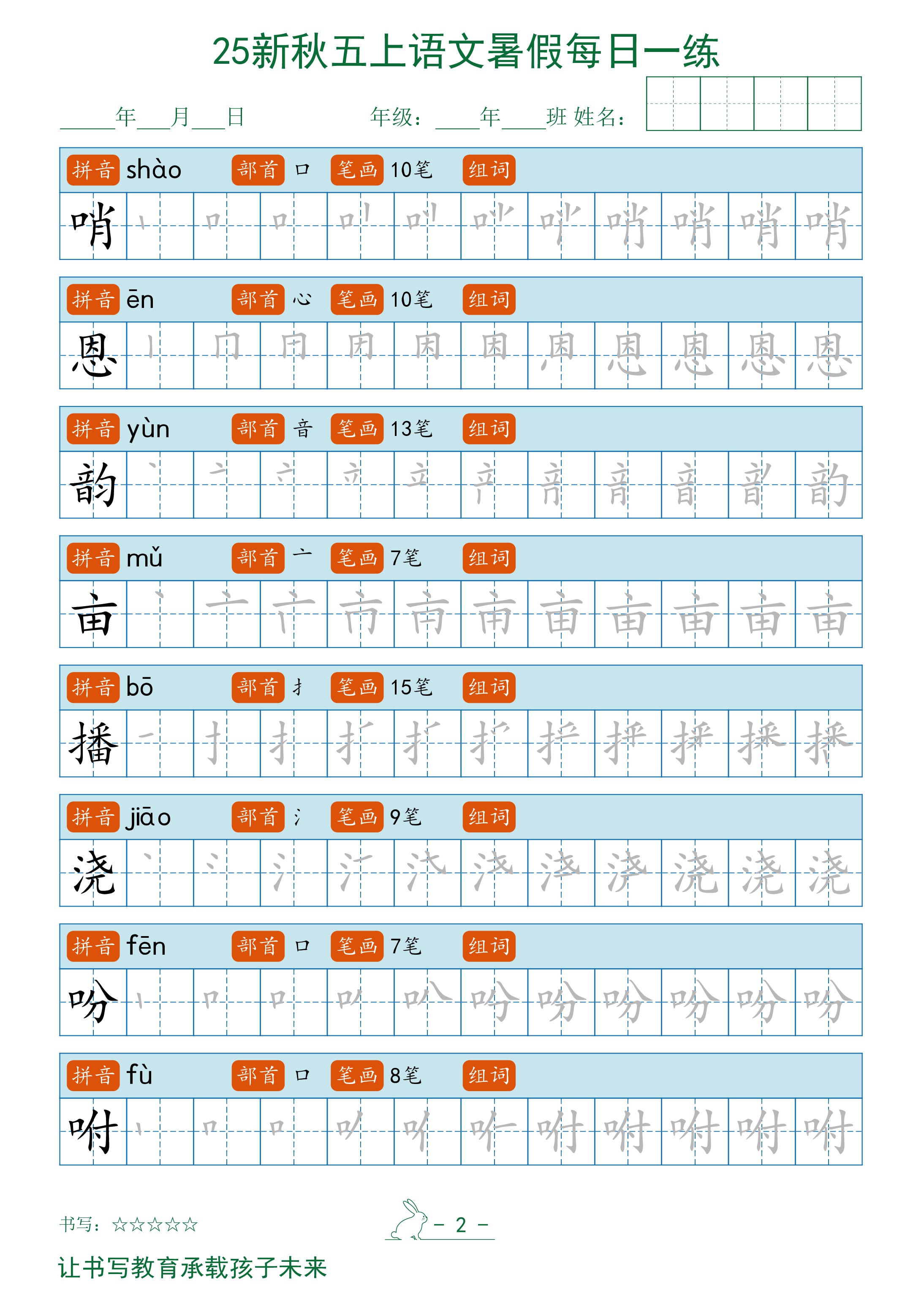 首页 > 全部 > 生字字帖 > 2025秋新五上语文暑假每日一练字帖