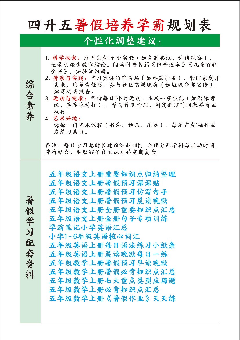 四升五暑假培养学霸规划表