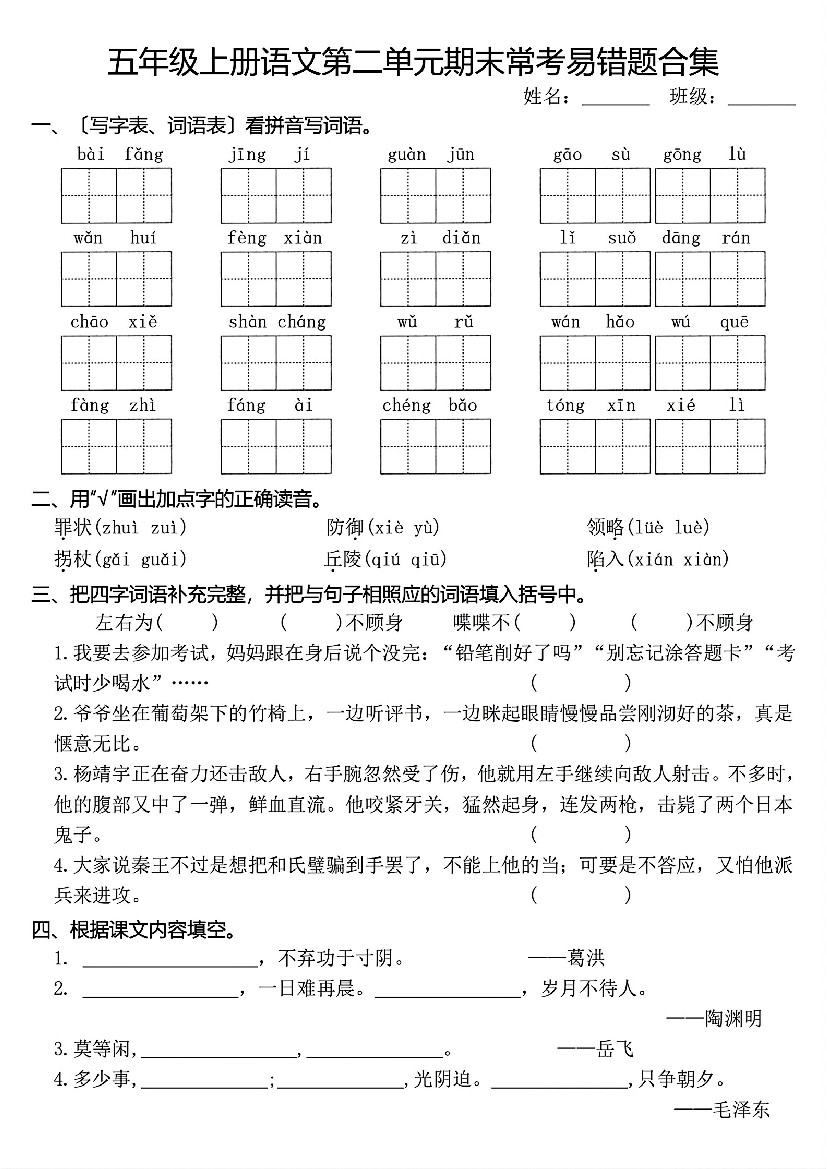 小学 五上语文1-8单元期末常考易错题合集(8页)