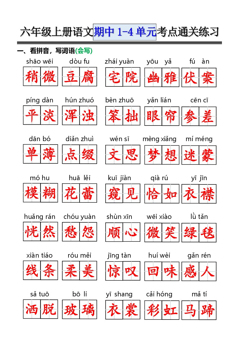 首页 > 全部 > 专项练习 > 六(上)语文期中复习考点通关练习(含答案6页)