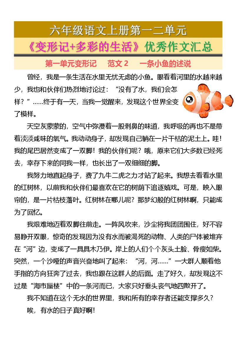 六年级语文上册第一二单元《变形记+多彩的生活》优秀作文汇总
