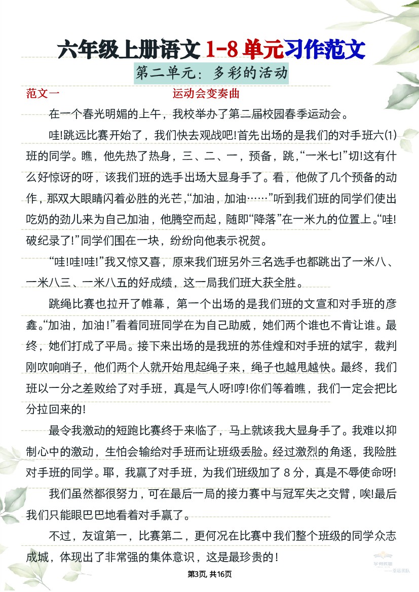 首页 > 全部 > 专项练习 > 六年级上册语文1-8单元习作范文