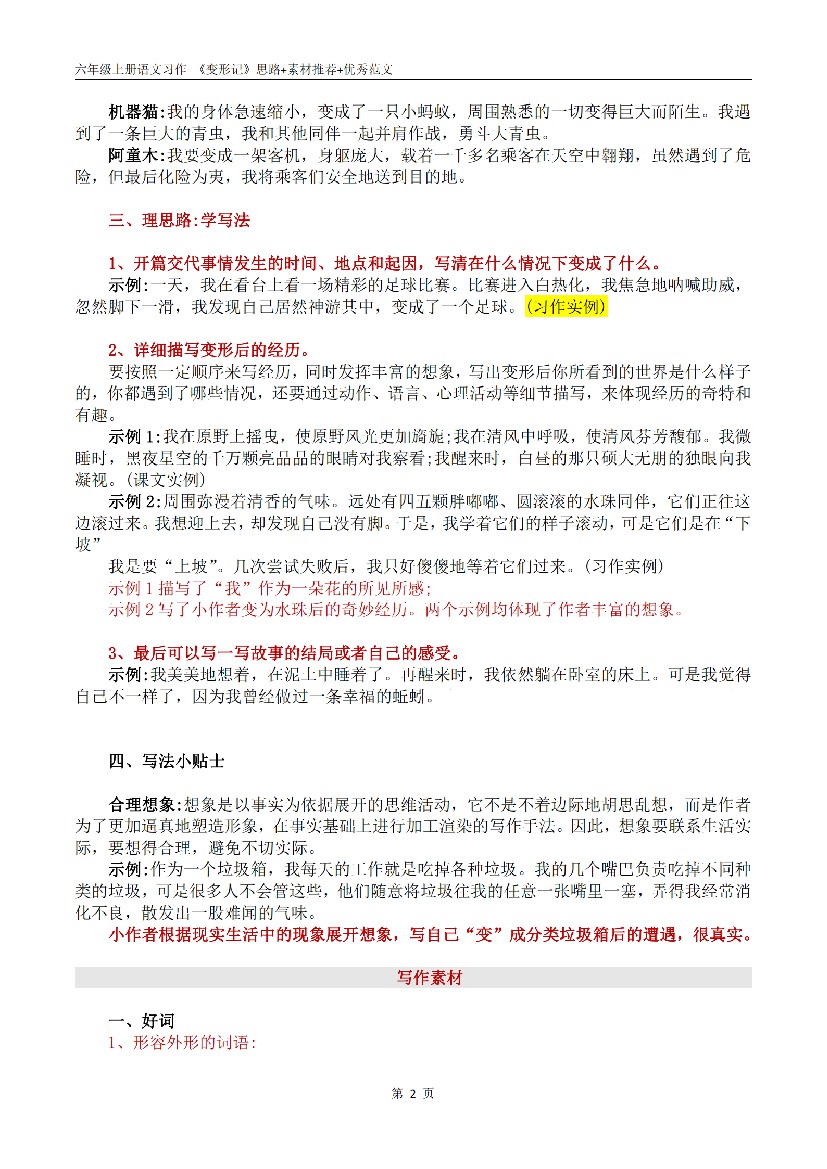 小学 《六年级上册语文习作 《变形记》思路+素材推荐+优秀范文》
