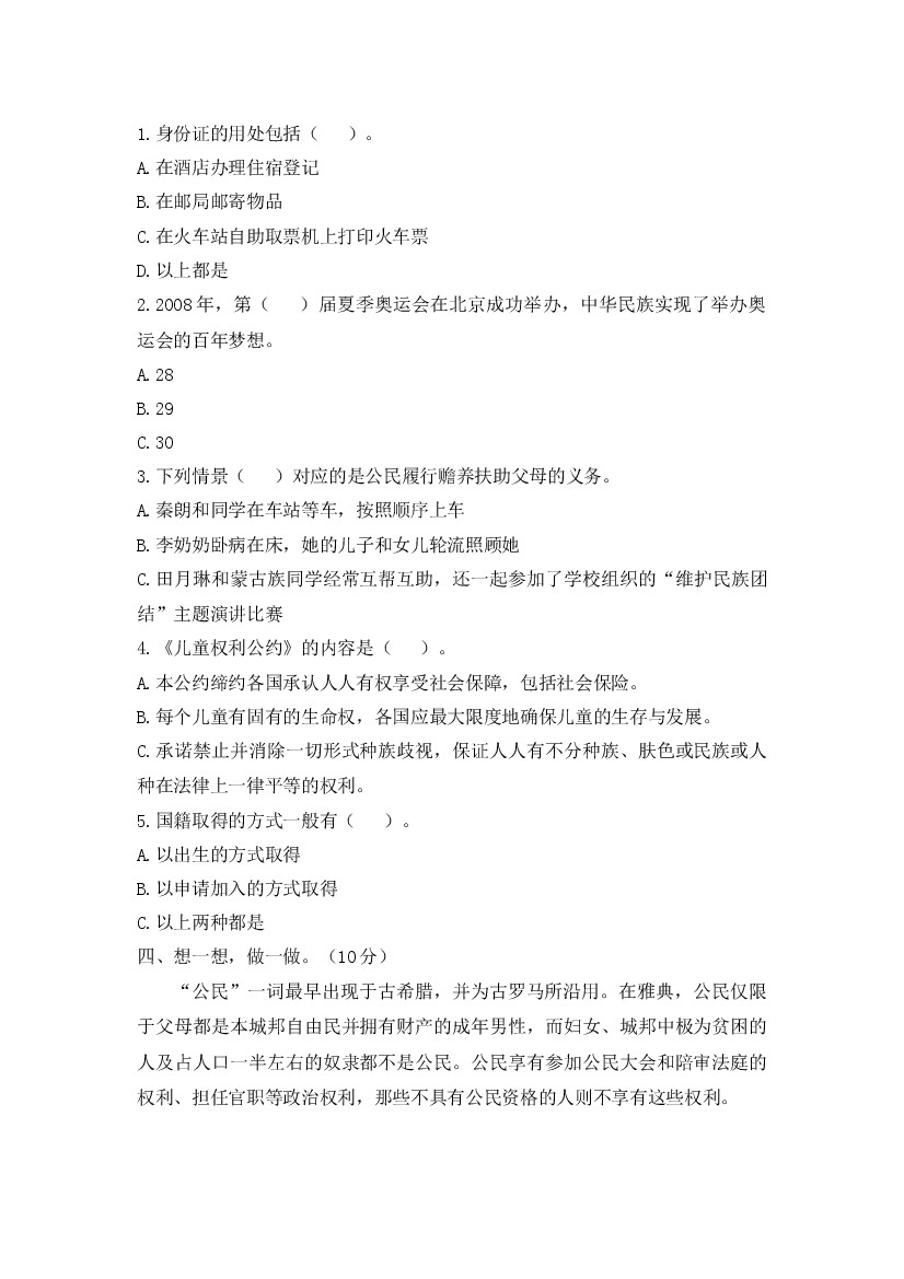 首页 > 全部 > 单元测试 > 六上丨道法 第2单元测试(1)(部编版)