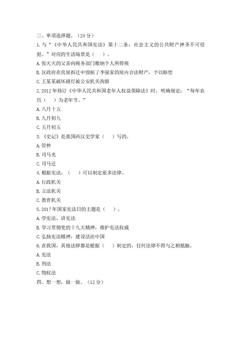 首页 > 全部 > 单元测试 > 六上丨道法 第1单元测试(1)(部编版)