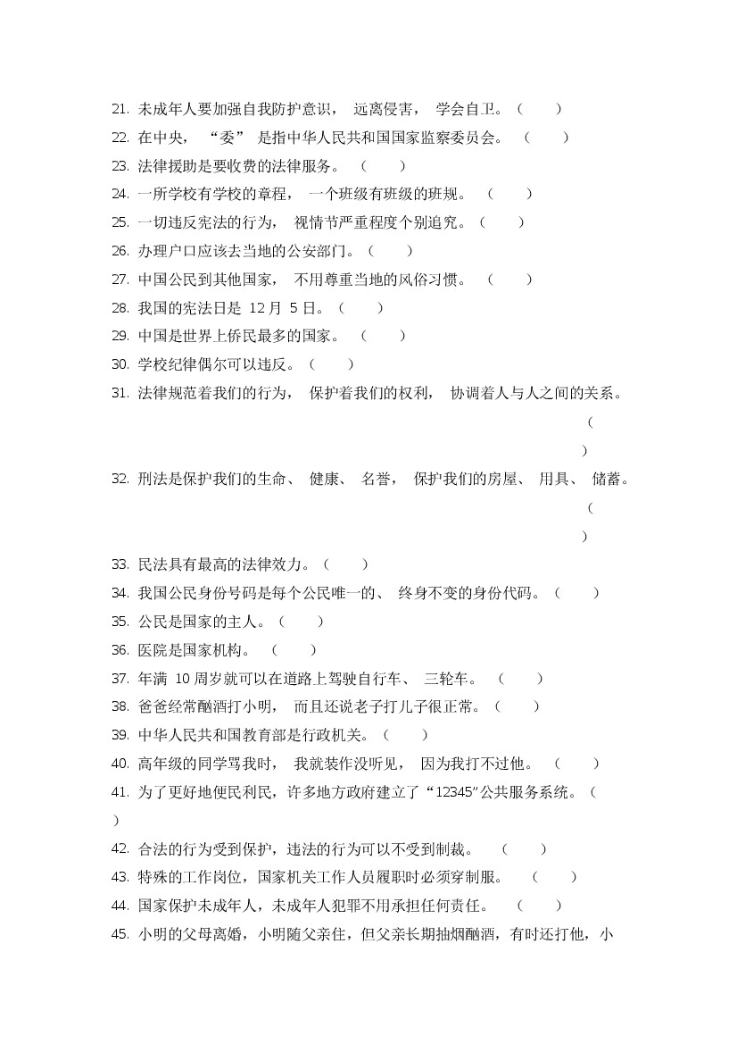 小学 六上道德与法治判断专题复习卷(含答案)