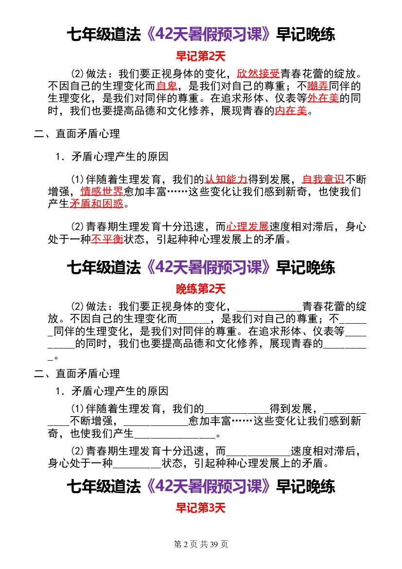 初中 七年级上道法《暑假预习课》早记晚练(42天)