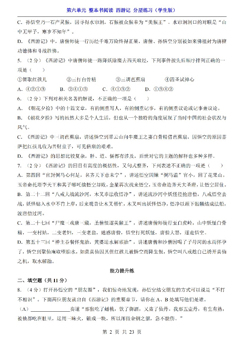 初中 七年级(上)语文第六单元 整本书阅读 西游记 分层练习