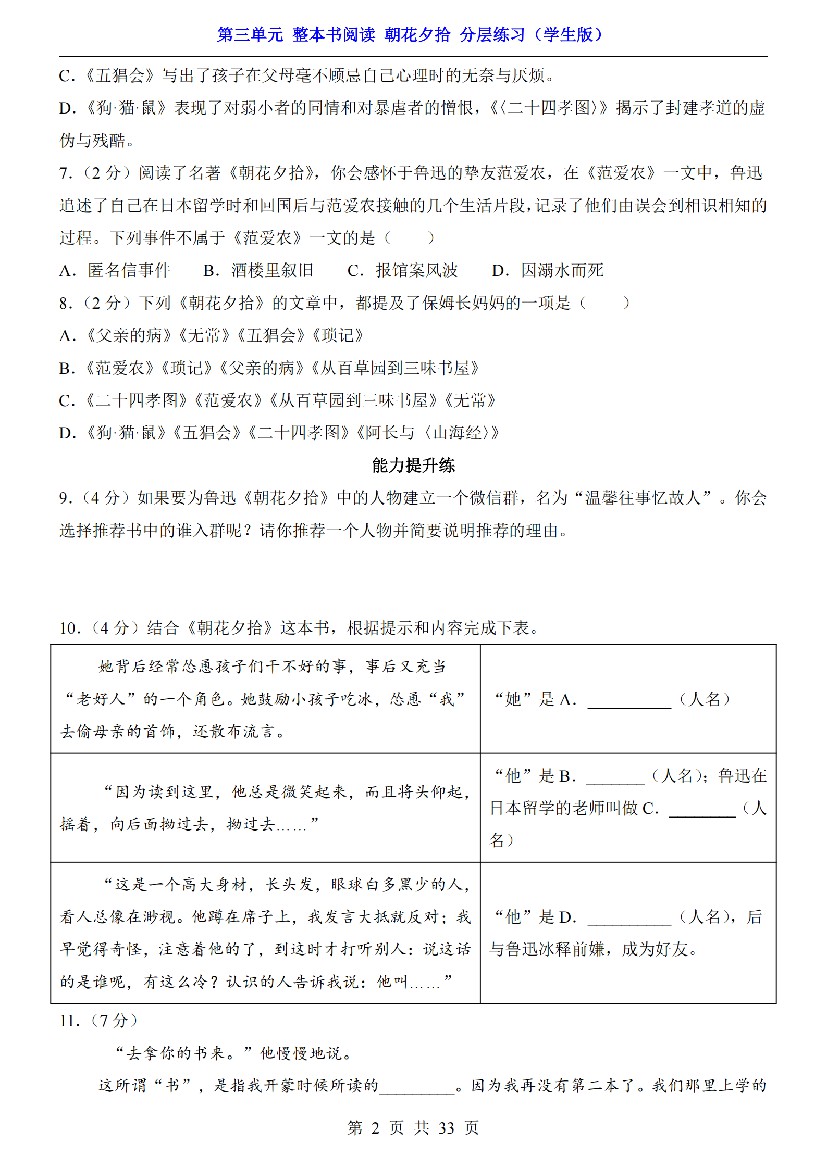 七年级(上)语文第三单元 整本书阅读 朝花夕拾 分层练习