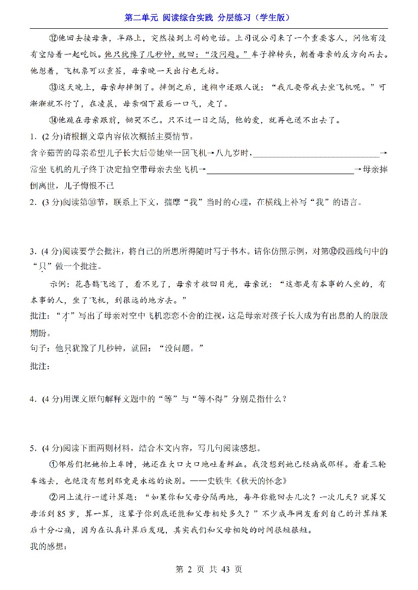 初中 七年级(上)语文第二单元 阅读综合实践 分层练习