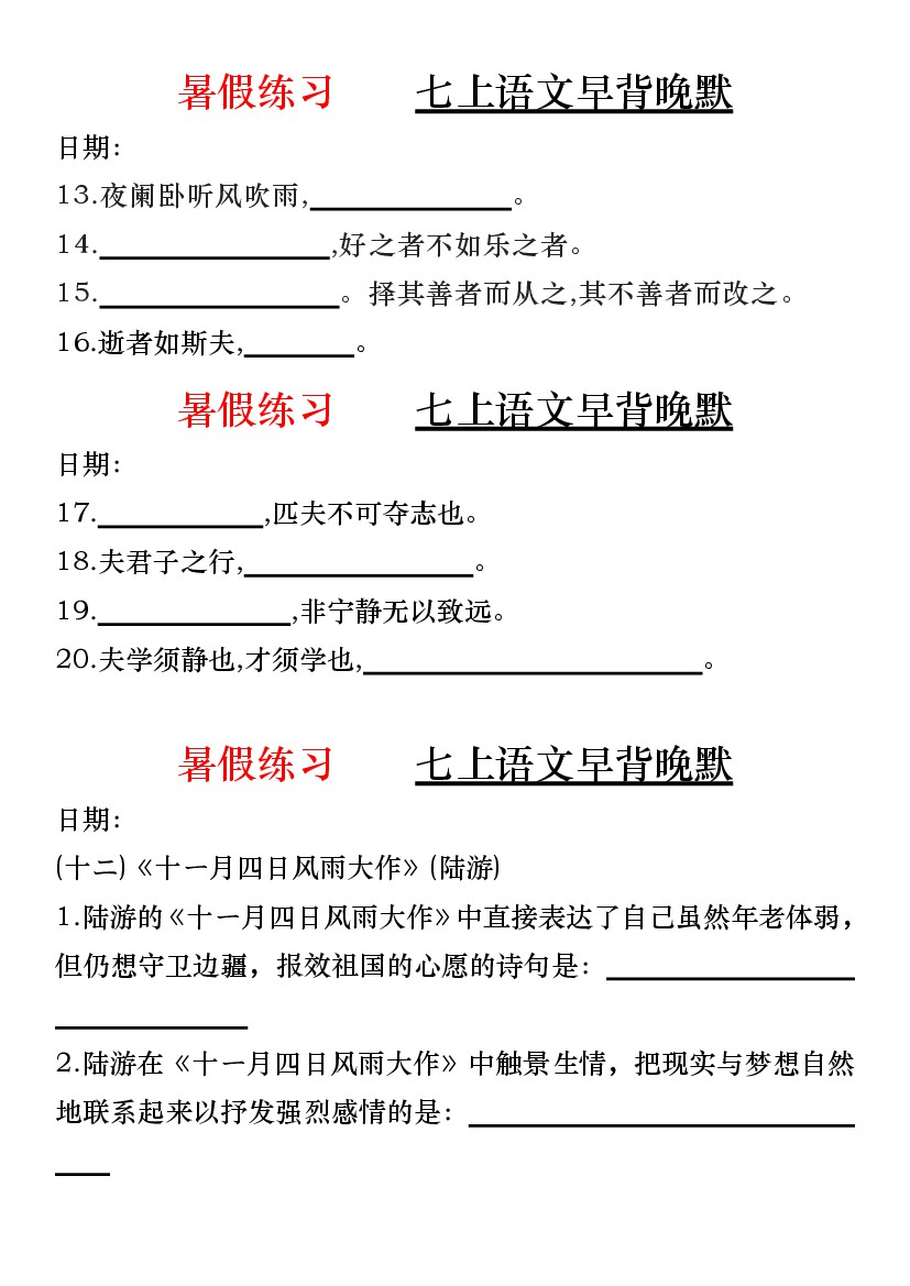 初中 暑假练习七上语文早背晚默(空白+答案)