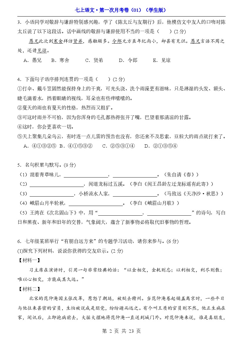 首页 > 全部 > 月考试卷 > 7上语文第1次月考01【第1-2单元】