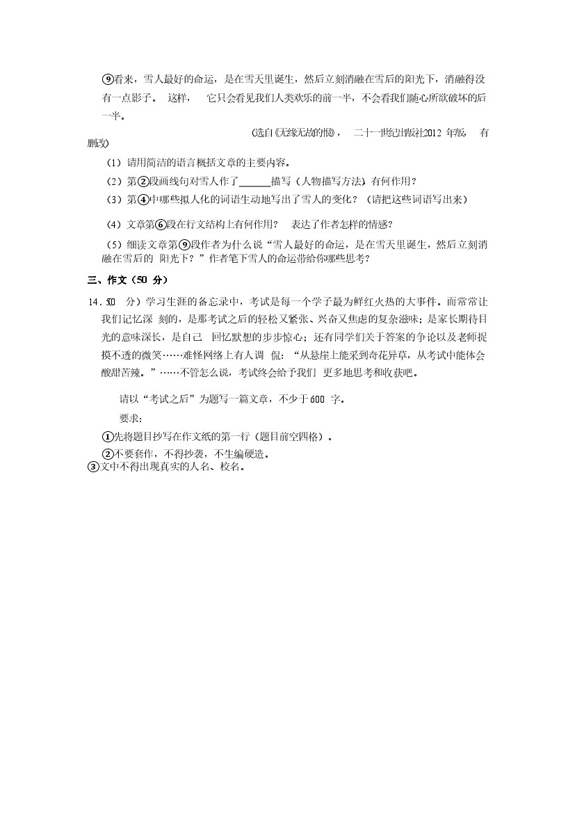 初中 七年级(上)语文期末试卷7-2卷人教部编版