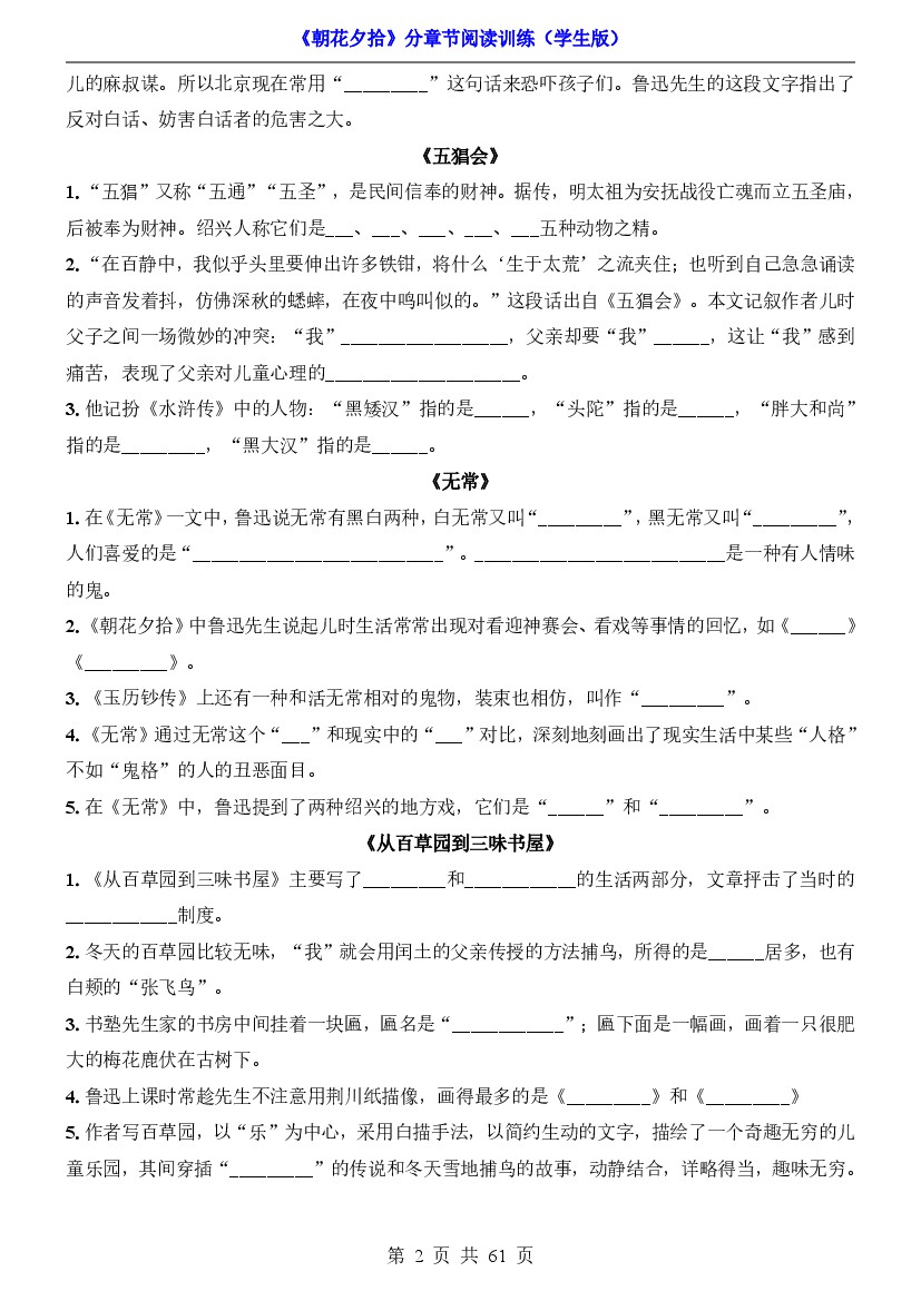 首页 > 全部 > 名著阅读 > 七年级(上)语文必读名著《朝花夕拾》分章节阅读训练