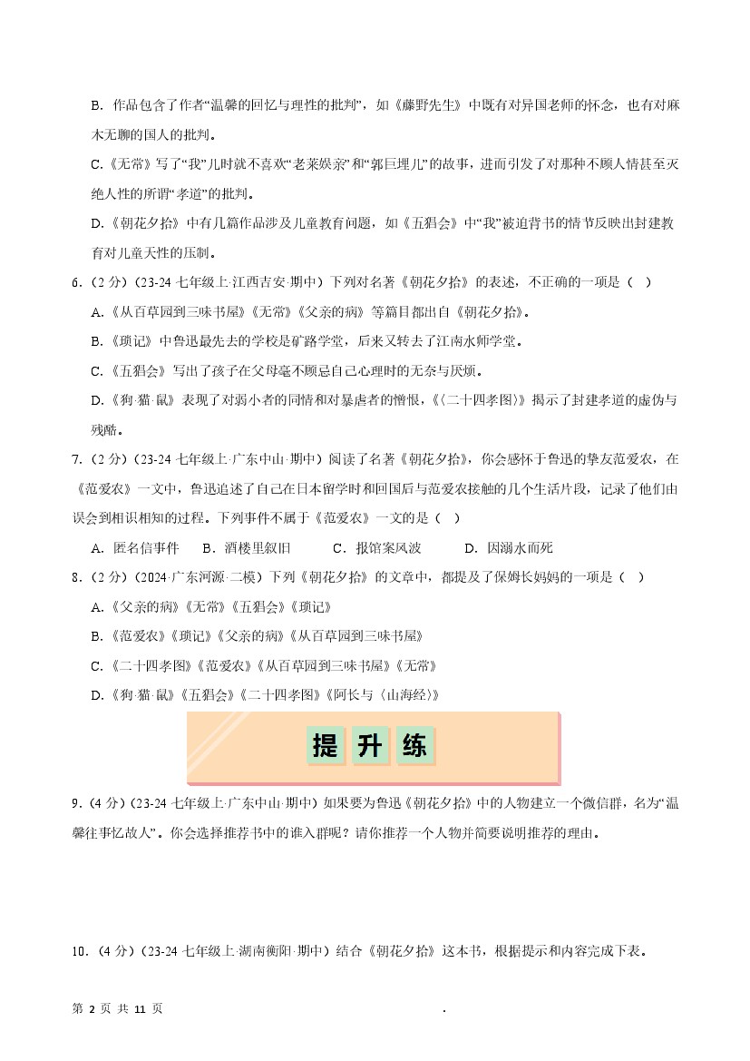 七年级(上)语文必读名著《朝花夕拾》整本书阅读分层作业